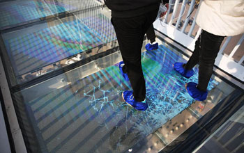 近期與“一踩就‘碎’的玻璃棧道”相關(guān)主題的短視頻在微博上瘋傳,眾多游客被玻璃破碎的痕跡及聲音嚇軟了腿,甚至尿褲子,讓人看了哭笑啼非的同時,又忍不住瑟瑟發(fā)抖。原來,這是景區(qū)特意模擬玻璃“碎了”做出的技術(shù)效果,橋面安裝雷達(dá)設(shè)備,能夠感應(yīng)到人的步伐,在腳步落下時,互動式LED地磚屏?xí)霈F(xiàn)玻璃破碎的畫面,讓你走到哪兒,玻璃碎到哪兒,還伴隨著“咔嚓咔擦”的玻璃碎裂聲,聲效立體環(huán)繞,嚇到根本分不清碎裂的是玻璃,還是自己那顆脆弱的玻璃心